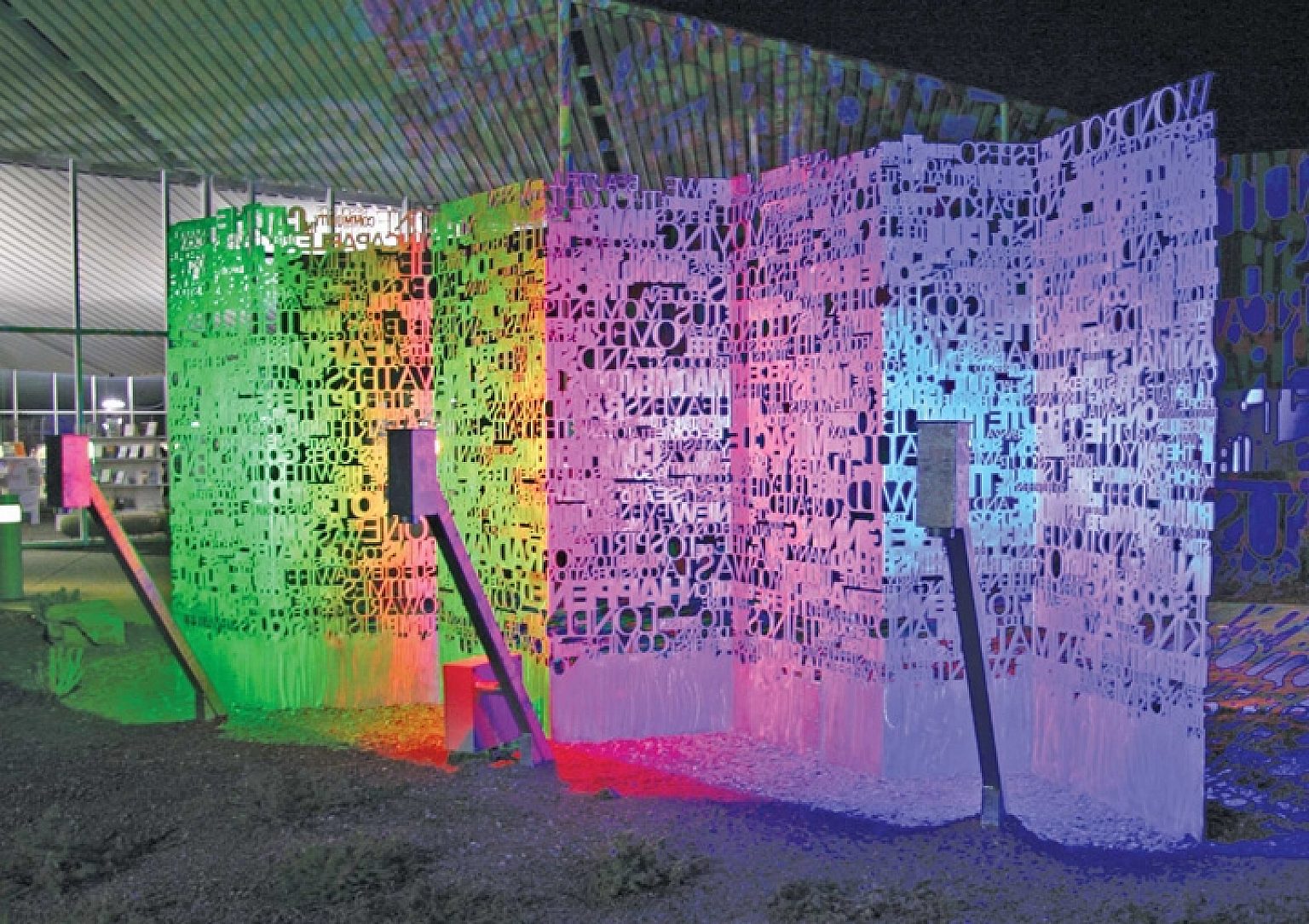 The HDG steel protects the structure from the damaging effects of the strident Arizona sun, as well as the light condensation that gathers during the night hours. In the evening, the Wall is illuminated by three powerful LED lights. Fuchsia, purple, aqua, yellow, lime, and green rays radiate over the words, stretching black shadows on the ground behind the panels. The words gleam silently through the night a lasting tribute to a library, where words will live on and the steel will be protected for generations.
