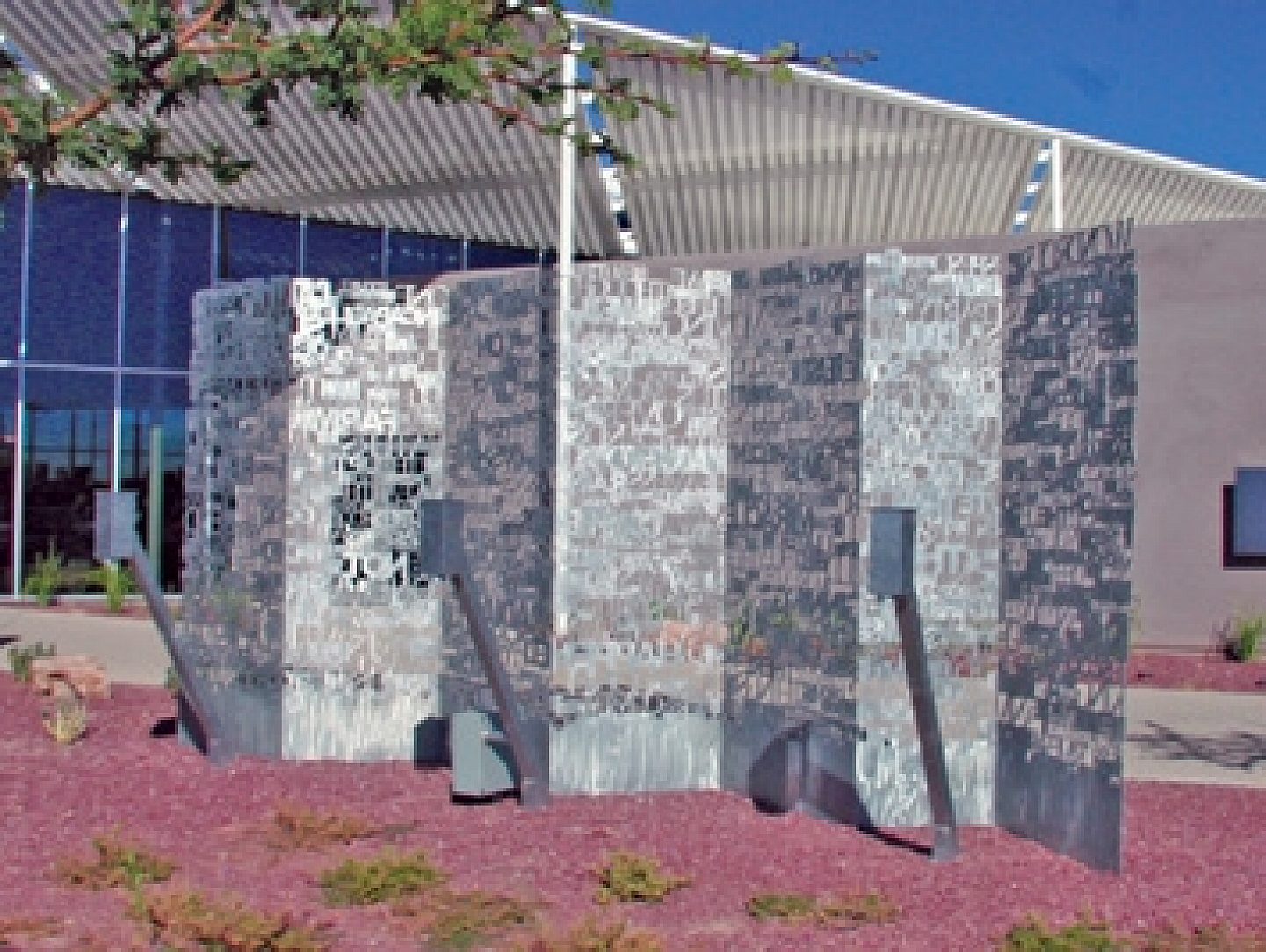 Glimmering in the heat of the Arizona sun, the Wondrous Word Wall greets visitors as they enter the Wheeler Taft Abbett Sr. Public Library. The wall, consisting of three 3 x 6 roll-formed galvanized steel panels, is a tribute to the words and phrases imprinted on the minds of readers everywhere. More than 1,000 words are inscribed in varied fonts and sizes across the panels, entreating the eye to wander across phrases plucked from timeless tomes such as the Bible and Shakespearean literature, and other sources such as Uncle Toms Cabin and Danielle Steele novels-even the words of Dr. Spock.